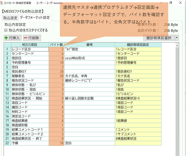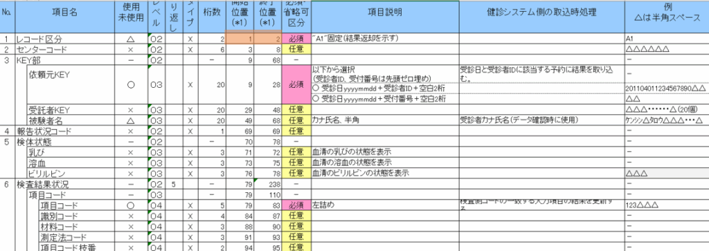 • 設計書の開始位置と終了位置を確認し、電文を作成する。例)レコード位置は1~2なので、画像の電文でいうと「A1」にあたる。