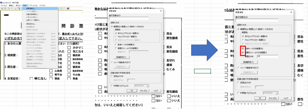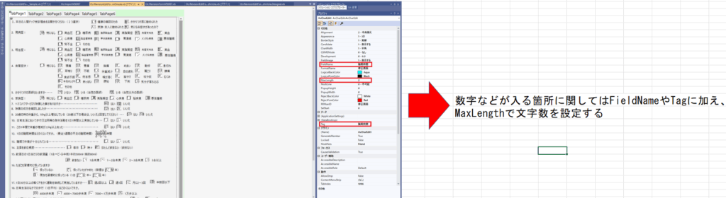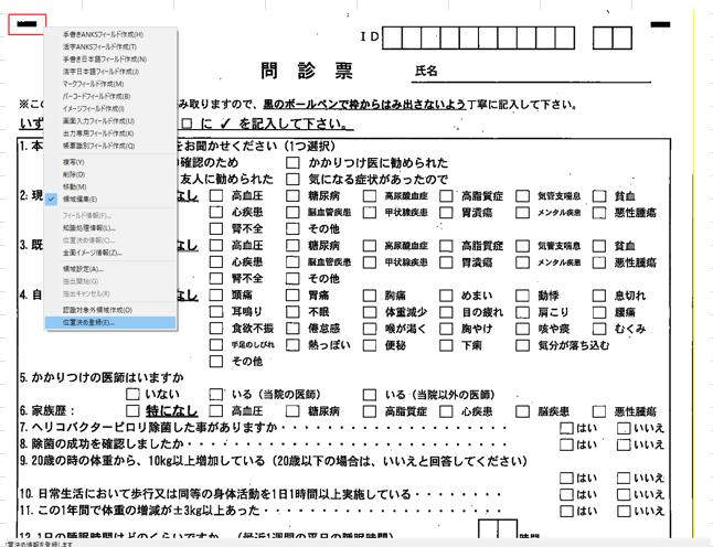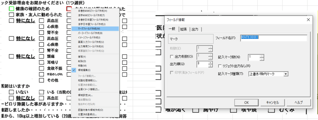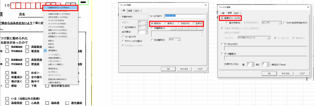 - 数字を入力する項目は1枠ずつ作成し、複数選択した後、手書きANKSフィールド作成を選択→ダブルクリックし、設計書通りにフィールド名を入力する。また、数字以外のチェックを外す。帳票IDフィールドの場合は帳票IDフィールドにチェックを入れる。